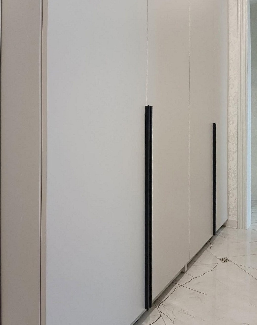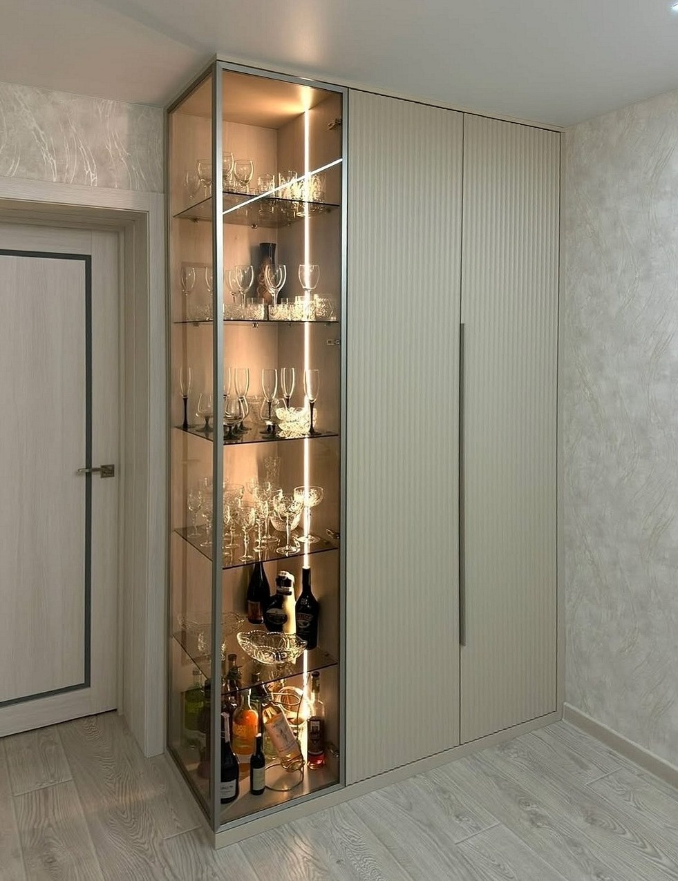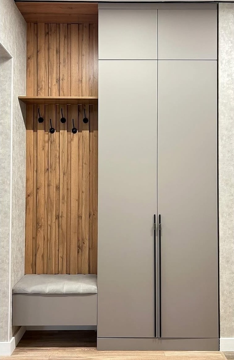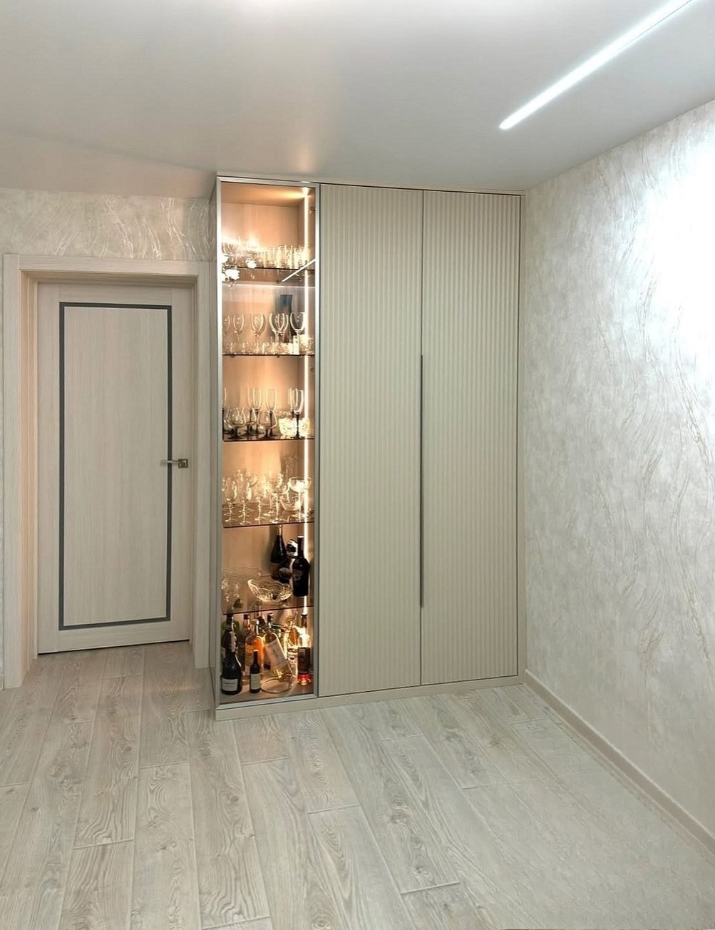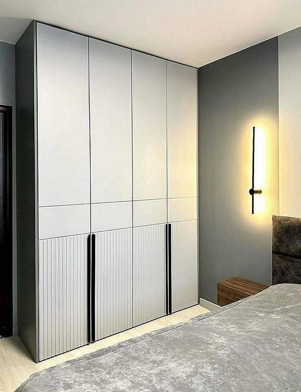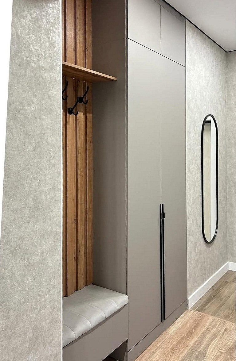 В результате у вас будет 3D-визуализация кухни с размерами и вариантами функционального наполнения. Вы познакомитесь с формой и цветом вертикальных ручек, с цветом и текстурой корпуса, а также с самим материалом дверей-купе.